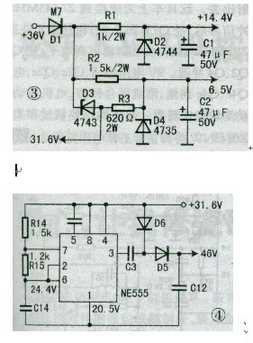 1.穩(wěn)壓電路 :該控制器的穩(wěn)壓電路如圖3所示(圖中 元件位號(hào)為自編號(hào))。其電路較簡(jiǎn)單,采用電 阻降壓、穩(wěn)壓二極管穩(wěn)壓,此方式已被越來(lái) 越多的無(wú)刷控制器所采用。 由于該控制器采用了無(wú)刷電機(jī)專(zhuān)用控 制芯片MC33035,加之驅(qū)動(dòng)電路供電由 NE555升壓后供給,所以對(duì)穩(wěn)壓電源的輸出 功率要求較低,采用穩(wěn)壓二極管穩(wěn)壓即能滿 足需求。 電池電壓+36V一路經(jīng)R1降壓‘、.c1濾 波后得到約+14.4V電壓,為MC33035DW 及過(guò)流、欠壓檢測(cè)IC(LM358)供電;另一路 經(jīng)R.2、I)4、C2穩(wěn)壓至6.5V,為轉(zhuǎn)把及霍爾 供電(此電壓在控制器所附的接線說(shuō)明圖中 標(biāo)注為5V,但實(shí)測(cè)為6.5V)。另外,此電源中 31.6V的取法較特殊,利用穩(wěn)壓二極管D3 的穩(wěn)壓特性,將R3和D4上的電壓穩(wěn)壓 為+31.6V,作為NE555的供電電源。圖中 D1為防反接二極管,防止因電池正負(fù)極連 接錯(cuò)誤損壞電路。 值得一提的是,該電路中的穩(wěn)壓二極管 的型號(hào)標(biāo)注分別為4744.、4743、4735,其實(shí)測(cè) 穩(wěn)壓值分別為14.4V、12.2V、6.5V。此類(lèi)穩(wěn)壓 二極管標(biāo)注不同于常規(guī)標(biāo)法,難以通過(guò)型號(hào) 得知其穩(wěn)壓值。實(shí)修中,可換用相同或相近 穩(wěn)壓值的穩(wěn)壓二極管,但功率應(yīng)不小于1W。