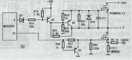 電池電壓經(jīng)R1、R2分壓后加到LM358 ③腳,作為同相輸入信號(hào),MC33035⑧腳輸 出的6.25V基準(zhǔn)電壓直接加到LM358的② 腳,作為反相輸入信號(hào)。電池電壓為36V時(shí), LM358⑧腳電壓約7.2V,高于②腳電壓, LM358④腳輸出高電平,D4截止,不影響 MC33035的工作狀態(tài);當(dāng)電池電壓下降至 31 V時(shí),LM358⑧腳電壓將低于6.25V, LM358q)腳輸出低電平,D4導(dǎo)通,MC33035 的@腳電壓降至近0V,電機(jī)停轉(zhuǎn),以防止蓄 電池過(guò)度放電o