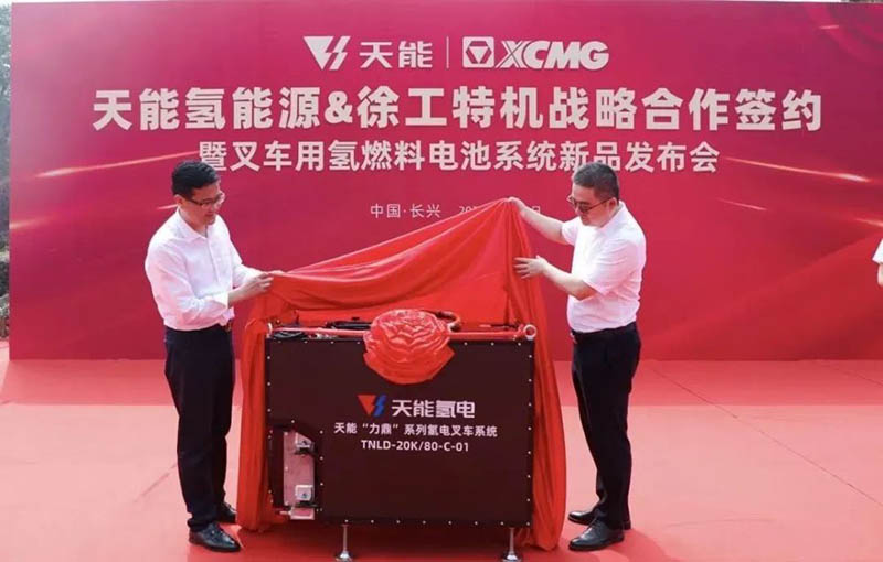 2021年9月28日,天能氫能源與徐工集團(tuán)旗下公司徐州徐工特種工程機(jī)械有限公司(下稱“徐工特機(jī)”)簽訂戰(zhàn)略合作協(xié)議。簽約儀式現(xiàn)場(chǎng),天能氫能源正式發(fā)布了徐工叉車用氫燃料電池系統(tǒng)新品。