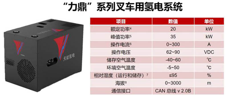 此次天能氫能源與徐工特機(jī)合作打造的適用于叉車專用的“力鼎”燃料電池系統(tǒng),額定輸出20kW,峰值輸出可達(dá)35kW,燃料電池電堆設(shè)計(jì)壽命可達(dá)10000h,兼容市面上大部分鉛酸或鋰電電動(dòng)叉車。產(chǎn)品在徐工叉車上進(jìn)行配置應(yīng)用后呈現(xiàn)“體積小,零碳排,加氫3分鐘、工作5小時(shí)”的特點(diǎn),有效解決了新能源叉車產(chǎn)品的續(xù)航問(wèn)題。